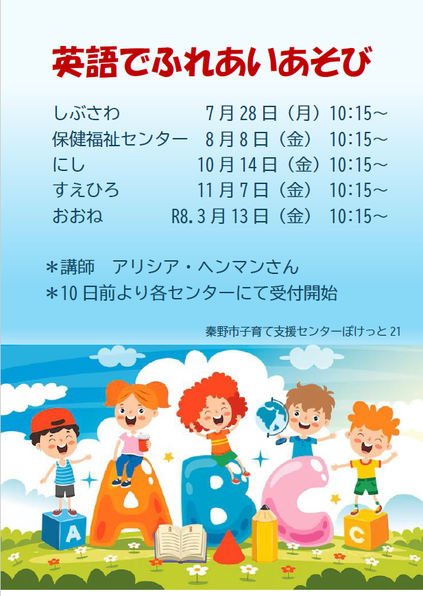 ぽけっと21しぶさわ、保健福祉センター、にし、すえひろ、おおねにて特別講座「英語でふれあいあそび」を開講します。