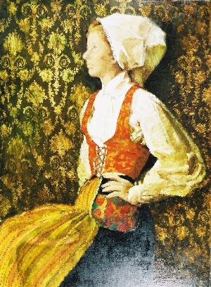 宮永は「自国の民族衣装を違和感なく着こなせるのは、その国の女性である」という持論から、各国の大使館を訪ね、衣装とモデル探しに奮闘します。本作品もデンマーク大使館員夫人に衣装を借り、夫人をモデルに制作されました。