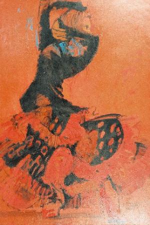 “動き”に対して強い関心を持った宮永はこの主題に熱心に取り組みました。中でも、一番動きが激しい舞踊と考えたフラメンコを題材にするようになり、取材のために本場スペインのダンサーが出演していた新宿の「エル・フラメンコ」に通い詰めたほどでした。舞台上の研ぎ澄まされた空気とダンサーの一瞬を描くことに没頭し、1966年頃から3年ほどの間に渡りリズム感あふれる動的な作品を多数制作しました。
