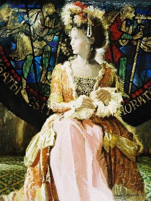 ステンドグラスを背景に、陽の差す方を向いて佇む女性は、柔らかで奥深い光を浴びて神秘的な雰囲気を漂わせています。また、ふわふわと優しいタッチで描かれた髪、首から胸元の透けるような肌、袖口のレースの繊細さは、女性の気品に満ちた美しさを一層際立せています。