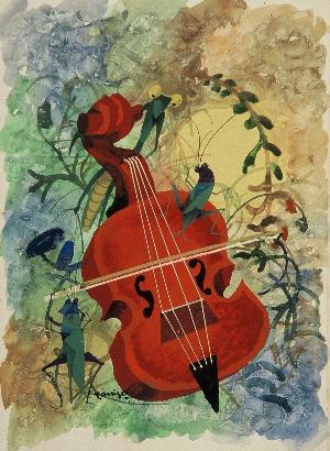 この作品は、虫たちが奏でる音楽が今にも聞こえてきそうな楽しい作品です。柔らかいタッチで描かれた背景と繊細に描かれた楽器や虫たちが、自然と音楽が調和する優しい世界を表現しています。宮永の描く童画は、小さい子どもが見ても素直にかわいいと思える愛らしい作品ばかりで、子どもに対する温かいまなざしや優しい人柄が感じられます。