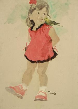 鮮やかなピンクのワンピースを着た女の子がポーズをとっています。ワンピースの襟やすそは黒いレースで縁取られ、かわいいだけの子ども服とは違うセンスが感じられます。しかし、三つ折りのソックスとベルトの靴、髪の毛にも赤いリボンで少女らしさは損なわれていません。肩に乗せた黄緑のセキセイインコで青みを加えて絵が仕上がっています。