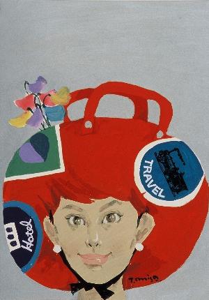この作品は、1966年5月14日号の表紙画です。春の旅行シーズンをイメージして描かれており、ボストンバッグの形をした帽子についているワッペンには「TRAVEL」「Hotel」と記され、春の花スイートピーがあしらわれています。女性の期待に満ちた眼差しと微笑んだ唇は、これから始まる旅に胸をときめかせているように見えます。美しい女性の表情とカラフルな色使い、ユニークなデザインは、人々の目を引き付けたことでしょう。