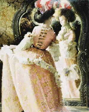 鏡に 映る女性の顔や壁の模様は精密に描かれていますが 、 頭部やドレスは荒い筆致です。しかし 、少し離れて見ると 、ふわふわとした髪や髪飾り、繊細なレースの質感まで表現されていることが 分かります 。また、鏡をのぞく女性のチャーミングなしぐさからは、グラフィックデザイナーとし てポスターや表紙画に生き生きとした女性を描き続けてきた宮永らしさを感じます。