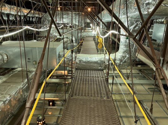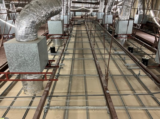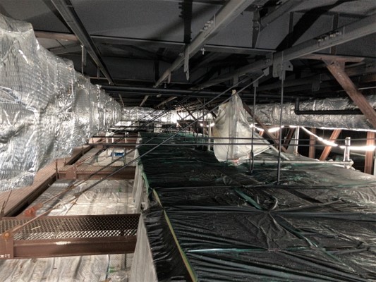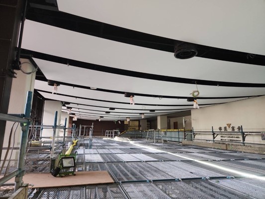 文化会館の大ホール、大ホールホワイエ、小ホールおよび市民ロビーの天井は、大規模地震等で落下しないよう対策を講じる必要のある特定天井に該当しています。