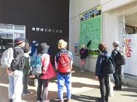 駅前広場で複数のハイカーが地図や資料を広げ、説明を聞きながら出発準備をしている様子を捉えた写真