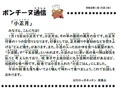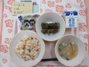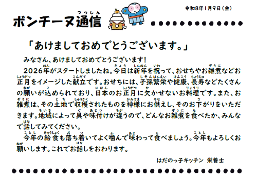 9日(金曜日) お正月献立「鶏そぼろ丼」、「さつまいもの甘煮」、「白玉雑煮」