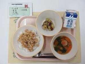 鶏そぼろ丼(ごはん)、さつまいもの甘煮、白玉雑煮、牛乳