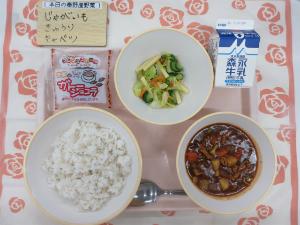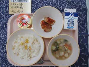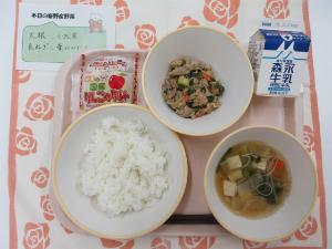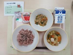 小豆ごはん(ごま塩)、豚肉のみそ炒め、うずらの卵と野菜の旨煮、いちごゼリー、牛乳
