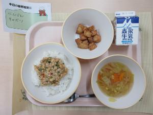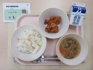 コーンピラフ、フレフレチキン、白菜と肉団子のスープ、牛乳