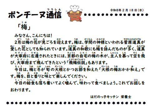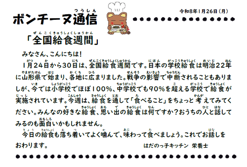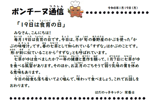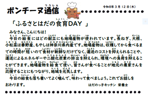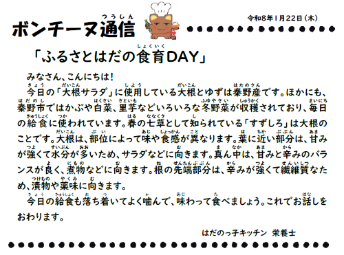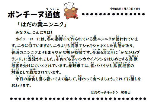 12日(木曜日) ふるさと秦野食育DAY 秦野産の長ねぎや大根、小松菜を使った献立