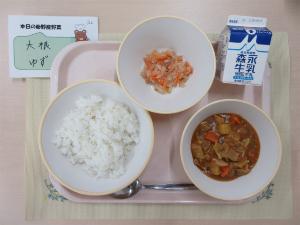カレーライス(もち麦入りごはん)、大根サラダ、牛乳