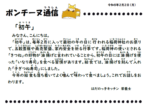 2日(月曜日) 初午献立「子ぎつね寿司」