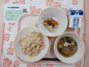 子ぎつね寿司、鶏肉のかりん揚げ、けんちん汁、牛乳