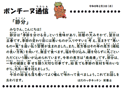 恵方巻(五目寿司、手巻きのり)、ちくわの磯辺揚げ、さつま汁、牛乳