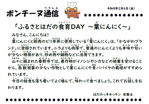 6日(金曜日) ふるさと秦野食育DAY「葉にんにくと豚肉のピリ辛丼」