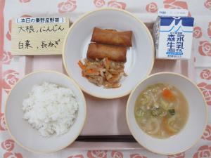 ごはん、春巻き、大根の梅おかか和え、冬野菜の味噌汁、牛乳