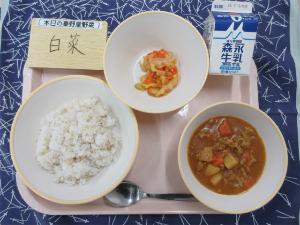 カレーライス(麦入りごはん)、白菜漬け、牛乳