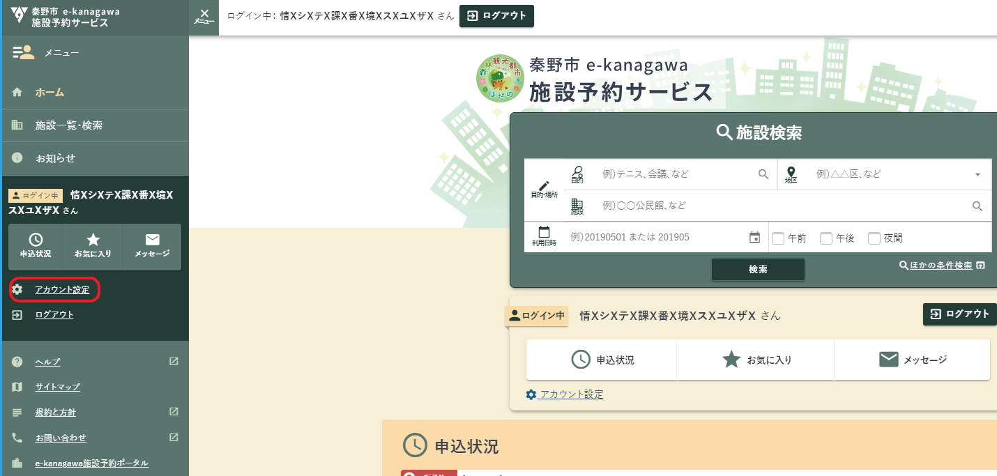 登録は、「施設予約システムメニュー」の中の「アカウント設定」から行うことができます。