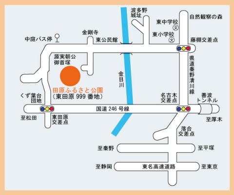 秦野中井インターチェンジで降り左折し、落合交差点を右折。秦野清川線70号をまっすぐ行き、藤棚の信号で左に曲がる。東小学校、東公民館を過ぎ、約500メートル後、路地へ左折(看板あり)