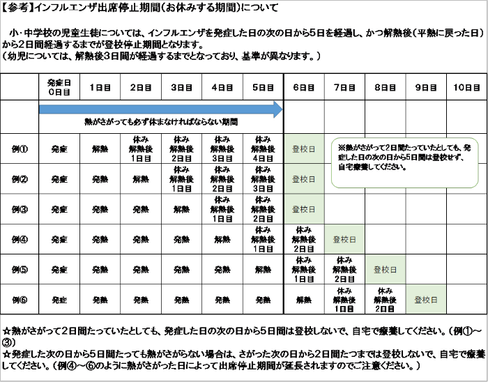 小中学校の児童生徒については、インフルエンザを発症した日の次の日から5日を経過し、かつ解熱後(平熱に戻った日)から2日間を経過するまでが登校停止期間となります。(幼児については、解熱後3日間が経過するまでとなっており、基準が異なります。) 登校に際しては、「登校届(インフルエンザ)」をご記入いただき、学校に提出してください。 登校届(インフルエンザ) (PDFファイル: 93.7KB)