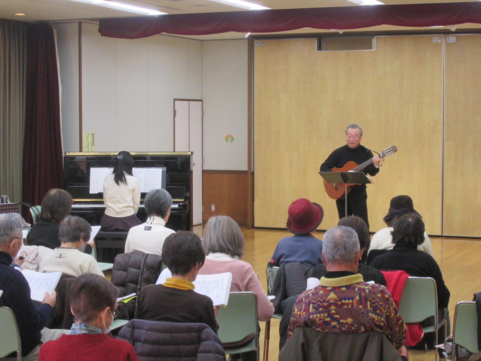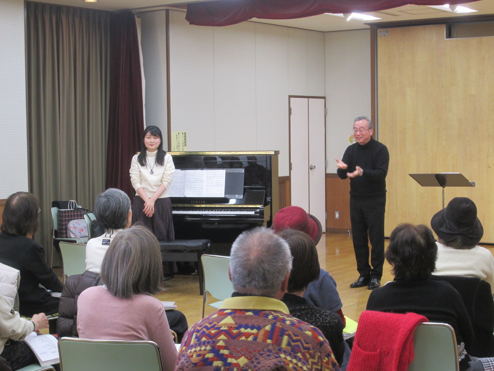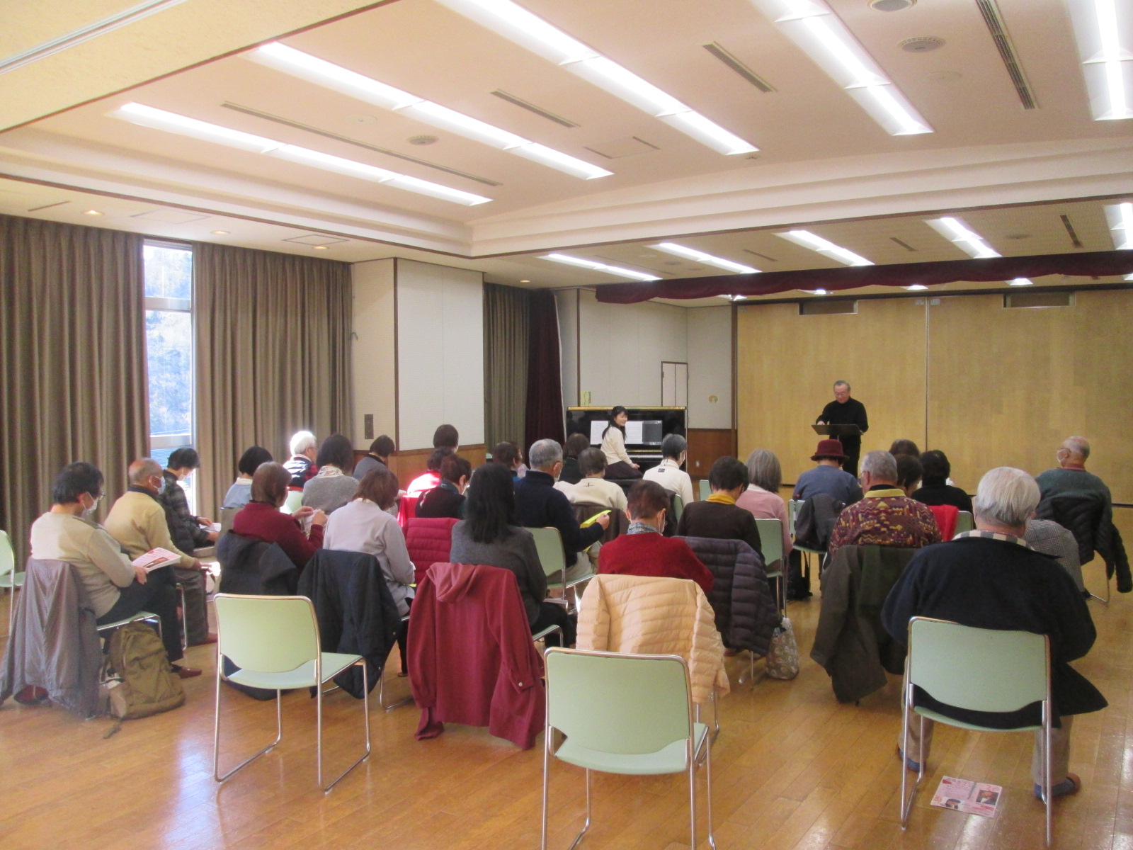 この講座は、昔よく聞いた懐かしい歌謡曲や思い出の曲をピアノの伴奏に合わせて歌う講座です。講座の前半は講師が歌集から事前に選んだ曲を参加者の皆さんと一緒に歌いました。今回は冬の季節にあった選曲が多かったです。曲を歌う前に、その曲の時代背景含め楽しい解説があり、笑いが絶えませんでした。休憩をはさんで後半は参加者からのリクエスト曲から歌いました。最後は講師がピアニストと一緒に「オペレッタ」を力強く熱唱されました。皆さん、歌って、聴いて、元気になって帰られました。