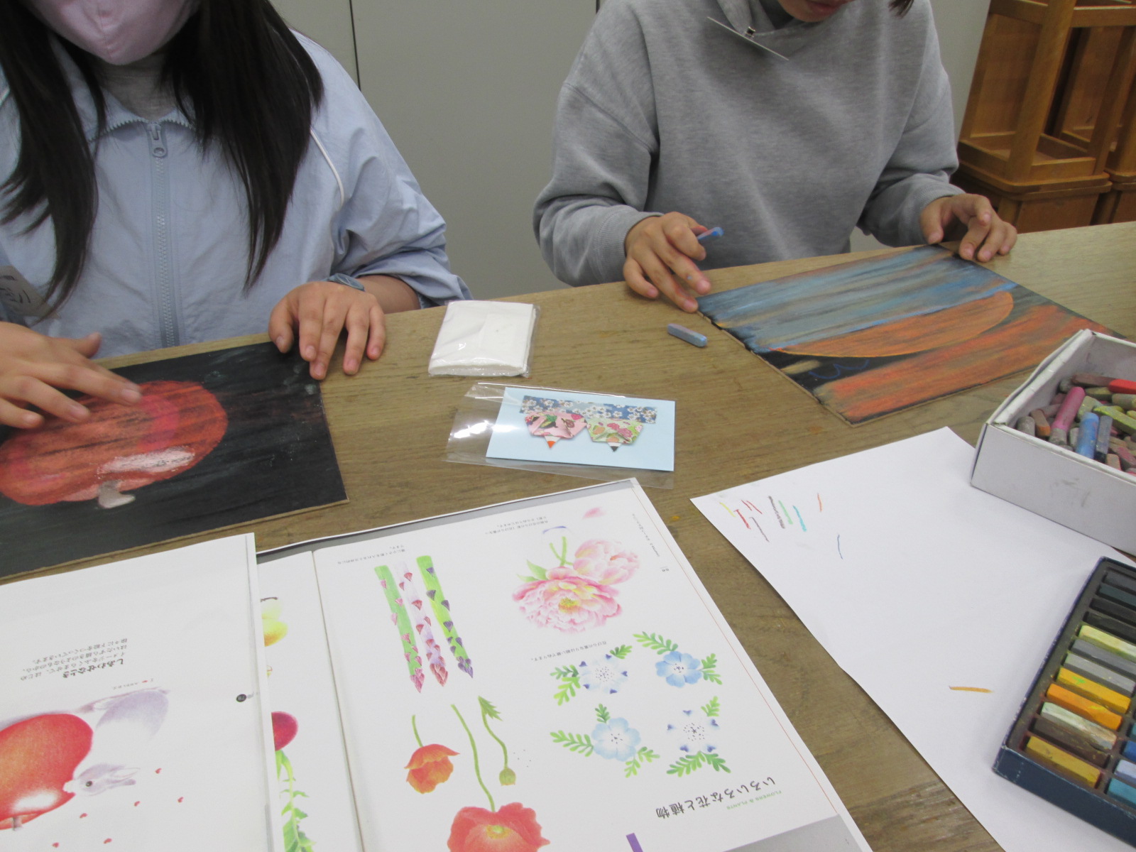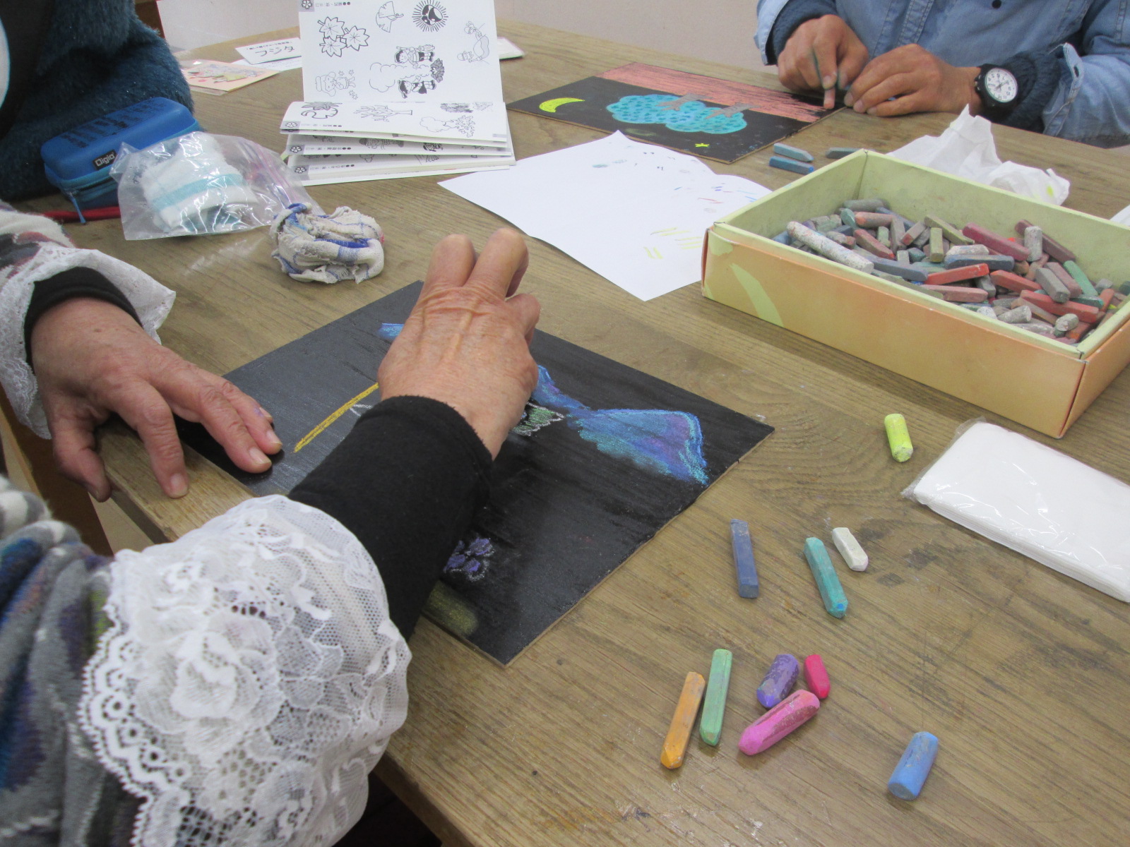 チョーク絵は、チョークを使って手作りの小さな黒板に色鮮やかな絵を描き、初心者でも「ぬり絵感覚」で楽しめます。最初に講師が、描き方の基本と色の載せ方やぼかし方を丁寧に教えてくれました。参加された皆さんは、参考資料を手本に描いていましたが、次第に自分の思うままチョークを手にして集中して描く楽しさや、自分だけのアレンジを加える達成感を味わっていました。