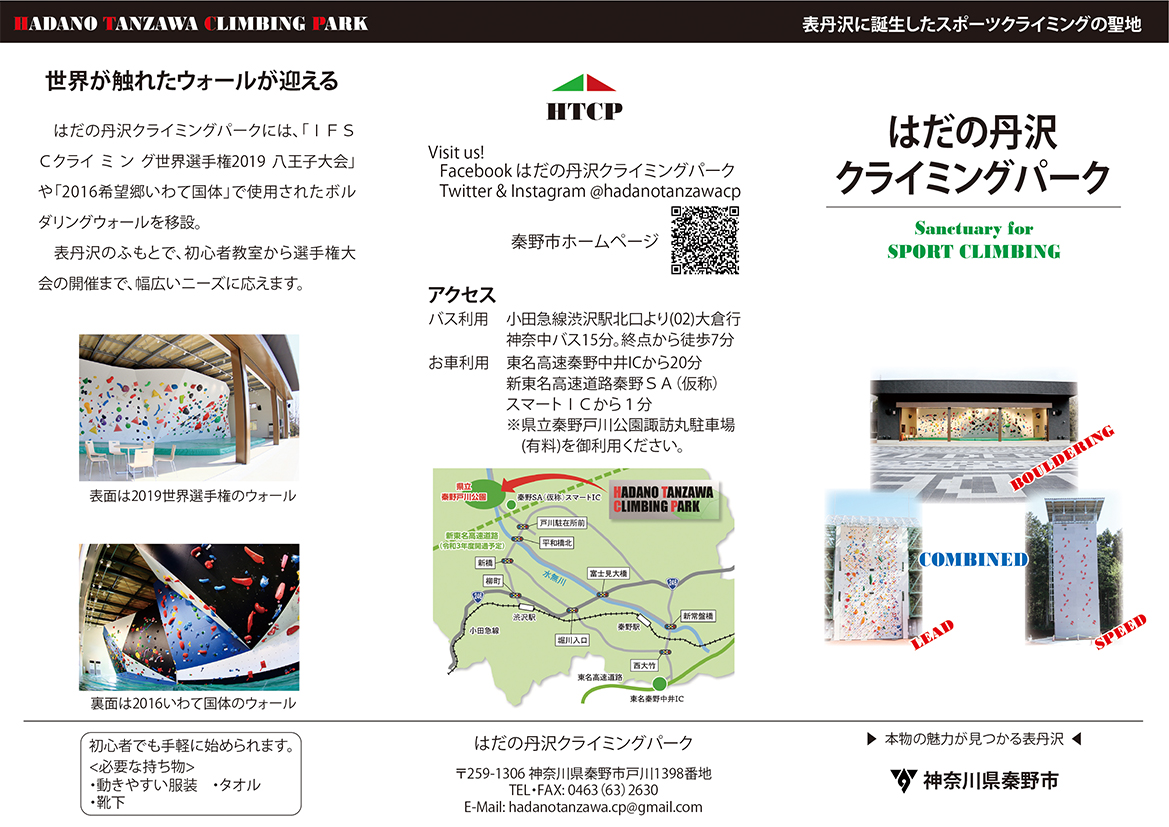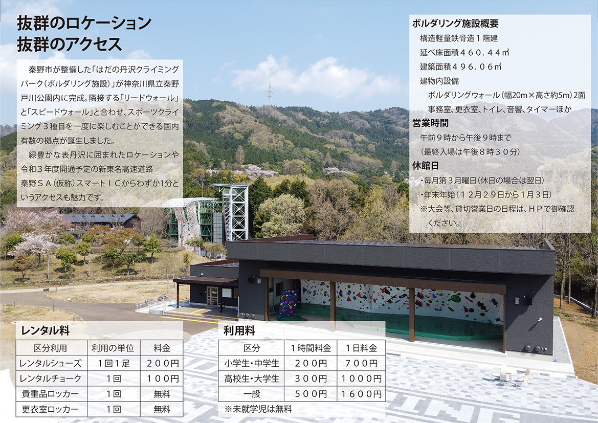 はだの丹沢クライミングパークは、表丹沢の玄関口、水無川河畔の神奈川県立秦野戸川公園内に新築された秦野市営のボルダリング施設です。