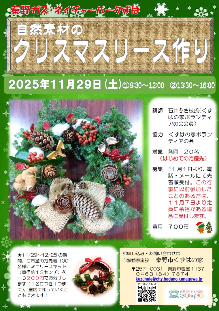 11月29日から12月25日までの期間、ご希望の方先着100名様にミニリースキット(直径約12センチ)を一つ200円でお分けします(1名につき1つまで)。