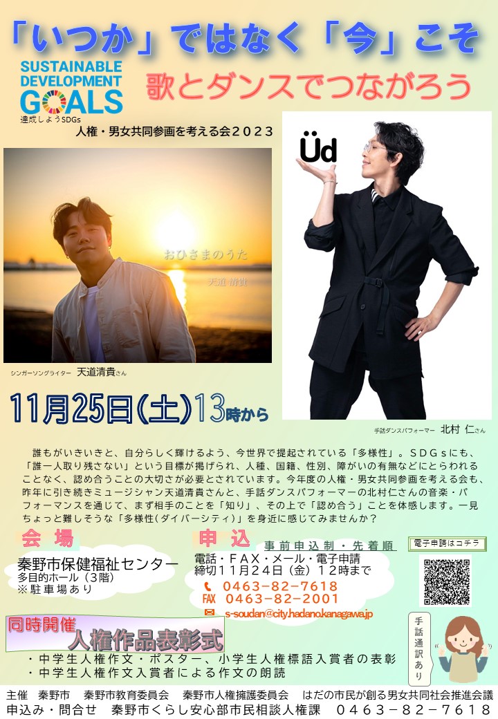 いま世界中で、人種や性別、障がいの有無にとらわれることなく、お互いの違い(多様性)を認め合うことが求められています。今年の人権・男女共同参画を考える会は、シンガーソングライターでありLGBTQ当事者である天道清貴さんと、手話ダンスパフォーマーの北村仁さんのパフォーマンスを通じて「多様性」を認め合う大切さについて学びました。