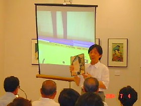 6月24日(木曜日)に国際浮世絵学会常任理事の新藤 茂氏が展示作品を解説しながら、歌舞伎の面白さを紹介しました。参加者30人は、豊国の著名な研究者の新藤氏の分かりやすい説明と、歌舞伎の豊富な知識に大満足の様子でした。