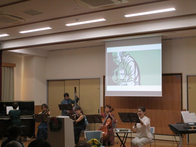 今回はゲストに「アンサンブル楓」さんを迎え、プロジェクターによる映像と朗読・コーラスと弦楽器のアンサンブルでつづる「音楽劇・モチモチの木」をはじめ、クリスマスナンバーの演奏で盛り上がりました。今回も100名に迫る参加者で大好評でした。