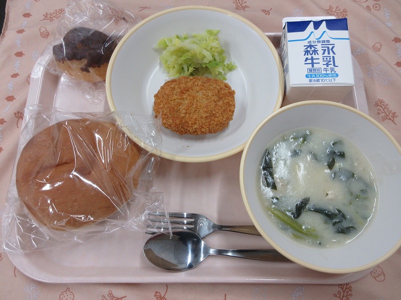 コロッケバーガー、マカロニの豆乳クリーム煮、ムースエクレア、牛乳