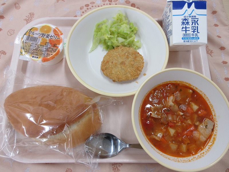 メンチカツサンド、ミネストローネ、フルーツ野菜ゼリー、牛乳