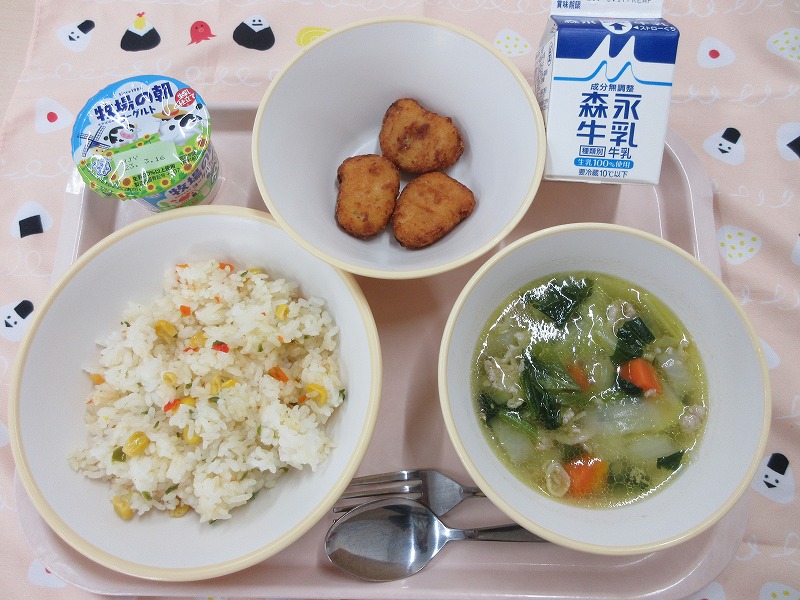 カラフルピラフ、チキンナゲット、ポトフ、ヨーグルト、牛乳
