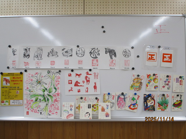 昨今の時流に乗り「年賀状仕舞い」をされる方が多くなりました。そのような中で昔から変わることのない午年の消しゴムスタンプ作り講座が開かれました。手作りの作品はやはり温かみがありホッとします。午は「物事がうまくいく」「幸運が駆け込んでくる」など言われる縁起の良い動物です。日頃お世話になっている方々に感謝の気持ちを込め手作りスタンプを押して縁起物のおすそ分け。講師の稲毛和子先生と「西の会」様からも参加者さまにお名前スタンプの素敵なサプライズプレゼントがあり皆様喜ばれていました。
